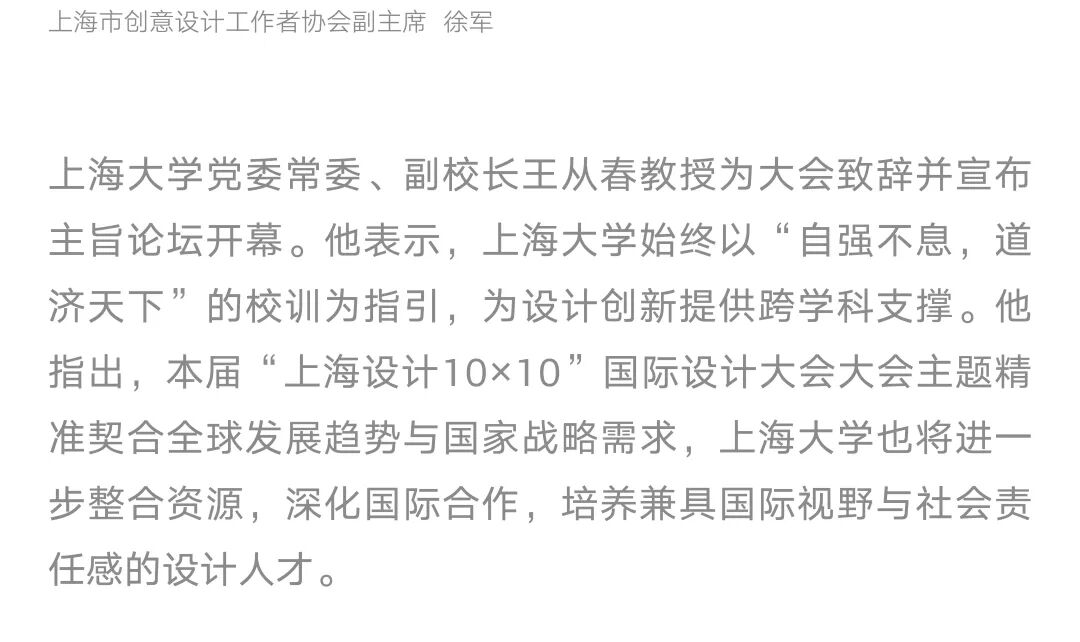 “上海设计10×10”是上海美术学院基于设计学学科使命的“上海设计”概念上建设的展览与交流项目,以“建构平台”“汇聚能量”“相互砥砺”“共创未来”为理念,集结遍布世界各地、历史悠久、跨越大洲、拥有顶级影响力的设计大赛组织及设计机构,每两年内分别举办“上海设计10×10全球大奖展”“上海设计10×10国际设计大会”。意在搭建全球设计交流平台,立足上海、放眼全球,提升上海设计之都“上海设计”的全球影响力。通过展览、论坛、工作坊、出版等不同维度,建构连结全球设计“大赛×大奖×大师×大作”的最佳平台,形塑全球设计大奖交流互动的顶级殿堂。同时,与世界顶尖设计大赛组织及设计机构建立合作关系,汇聚全球设计精华。 Based on the mission of the design discipline, Shanghai Academy of Fine Arts has established the exhibition and exchange project of “Shanghai Design 10×10” on the concept of "Shanghai Design". Under the concept of “constructing platform”, “concentrating energy”, “mutually enthusiasm” and “creating the future together”, “Shanghai Design 10×10” gathers design competition organizations and design institutions with worldwide, long-standing, crossing four continents and top influences, and holds “Shanghai Design 10×10 Global Award Exhibition” and “Shanghai Design 10×10 Global Design Summit” every two years. With the base of Shanghai and the global view, the events aim to build an international design exchange platform and enhance the design competitiveness of Shanghai Design Capital. Through exhibitions, forums, publications and other different dimensions, the event is built into the best platform to connect the global design “big competitions, grand prizes, masters, great works”, and has become the top hall for communication and interaction of global design awards. At the same time, “Shanghai Design 10×10” has established cooperative relationships with the world's top design competition organizations and design institutions, bringing together the essence of global design.