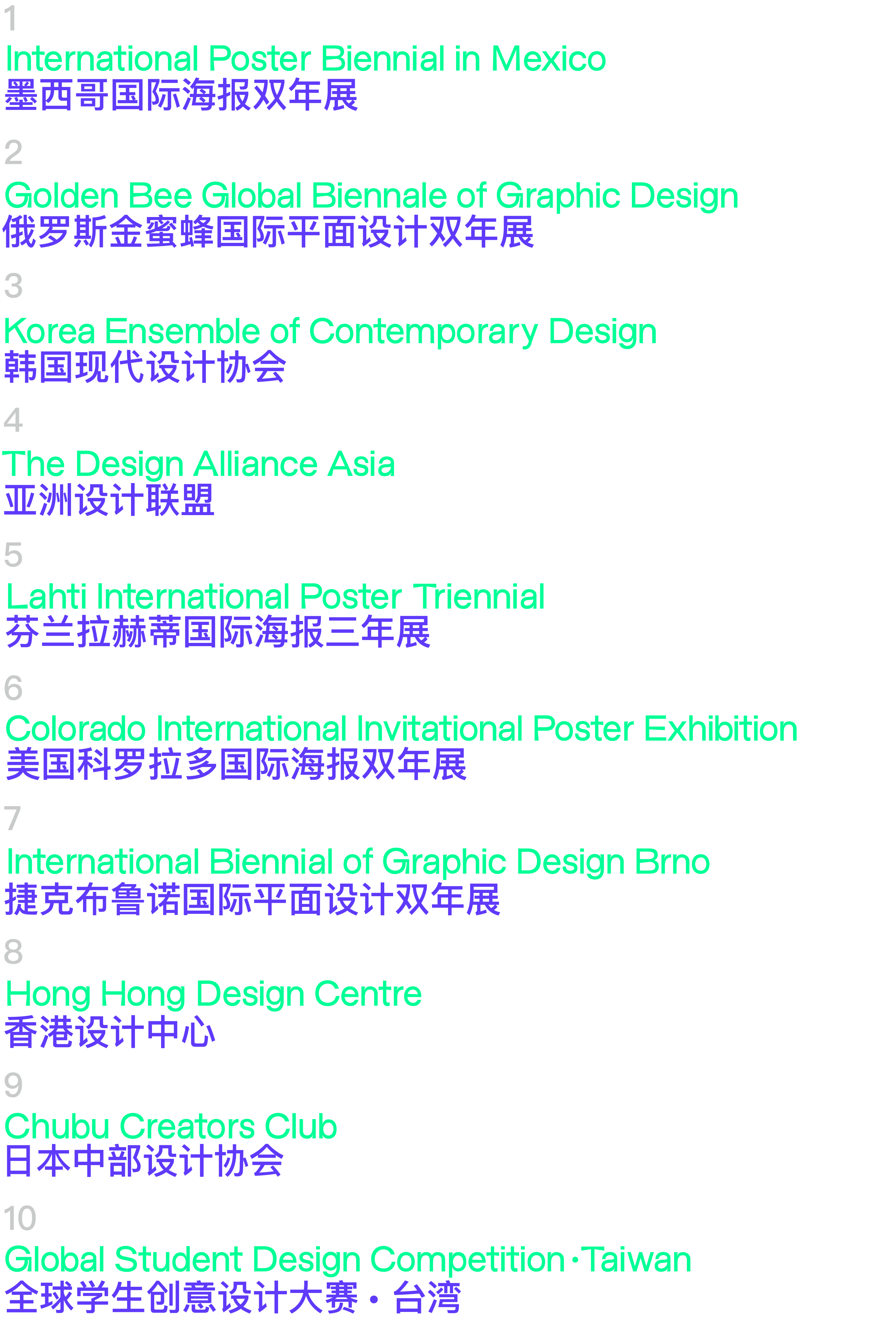 "Shanghai Design 10×10" is an exhibition and exchange project that extends the concept of "Shanghai Design". It aims to enhance the international influence of "Shanghai Design" and create an international design exchange platform for "Shanghai Design". It assembles 21 design competition organizations or design institutions with worldwide, long-standing, crossing four continents and top influences. The "Shanghai Design 10×10 Global Awards Exhibition" and the "Shanghai Design 10×10 Global Design Summit" are held every two years.