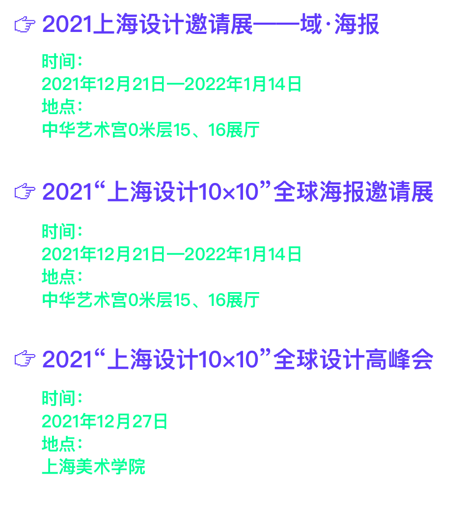 “2021‘上海设计10×10’全球海报邀请展”是本年度“上海设计10×10”活动的展览环节,以“上海印象”为主题,通过全球11位联合策展人邀请了来自20多个国家和地区的100余位顶尖设计师进行主题性海报创作,旨在展现全球设计师对上海城市的印象和图像表达。以此,形成与“上海设计邀请展——域•海报”之对话,助推中国设计全球影响力,促使全球设计在上海发声,促进未来设计在上海发生。