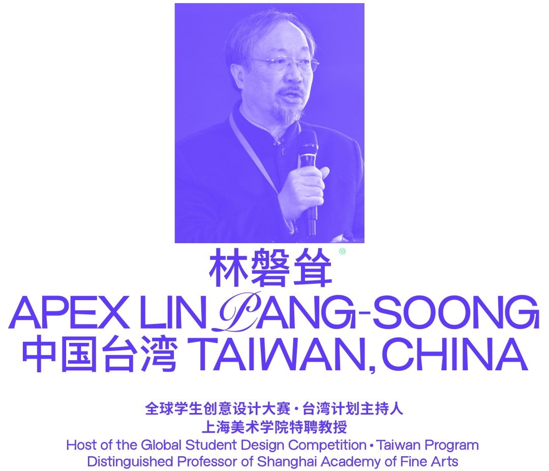 Apex Lin, Pang-Soong, Distinguished Professor of Shanghai Academy of Fine Arts, Chairman of Taiwan Design Alliance, Chairman of Taiwan Industrial Design Association, Founding Chairman of Taiwan Cultural and Creative Industries Alliance Association, Host of Global Student Creative Design Competition - Taiwan Program.Professor Apex Lin, Pang-Soong enjoys a great reputation as the supervisor of Taiwan design community. Now he is the chair professor of Asia University, the doctoral advisor of China Academy of Art, Shanghai Institute of Design, the honorary professor of National Taiwan Normal University. He used to be the professor and dean of the Department of Fine Arts at National Taiwan Normal University, the professor and dean of the Department of Visual Design, the director of Cultural & Creative Industries Center and the vice president of National Taiwan Normal University. Being honored as trailblazer of Taiwan CIS, he designed corporate identity system and brand for several companies, such as Taipei National Palace Museum. He used to be a judge for Red Dot Design Award, Adobe Design Achievement Award, International Poster Biennial in Mexico, G-mark Design Award and China International Poster Biennial, and was invited to be an international judge and a visual image design counselor of Emblem Design Competition of 2008 Beijing Olympic Games.