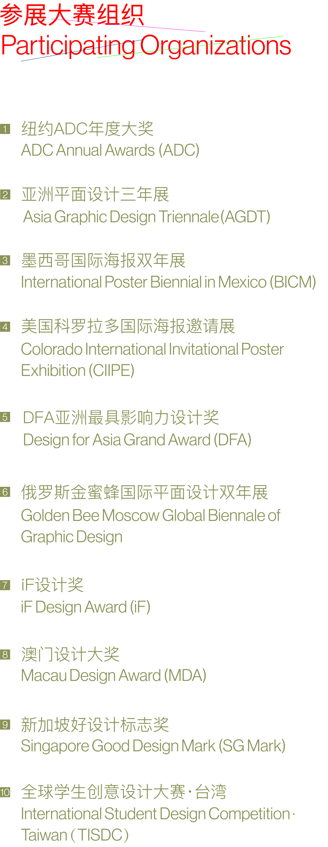 “2024‘上海设计10×10’”活动期间,将邀请10个全球知名的设计大奖及设计大展等组织前来参加,分别是:纽约ADC年度大奖、iF设计奖、俄罗斯金蜜蜂国际平面设计双年展、新加坡好设计标志奖、科罗拉多国际海报邀请展、亚洲平面设计三年展、墨西哥国际海报双年展、澳门设计大奖、亚洲最具影响力设计奖、全球学生创意设计大赛·台湾。