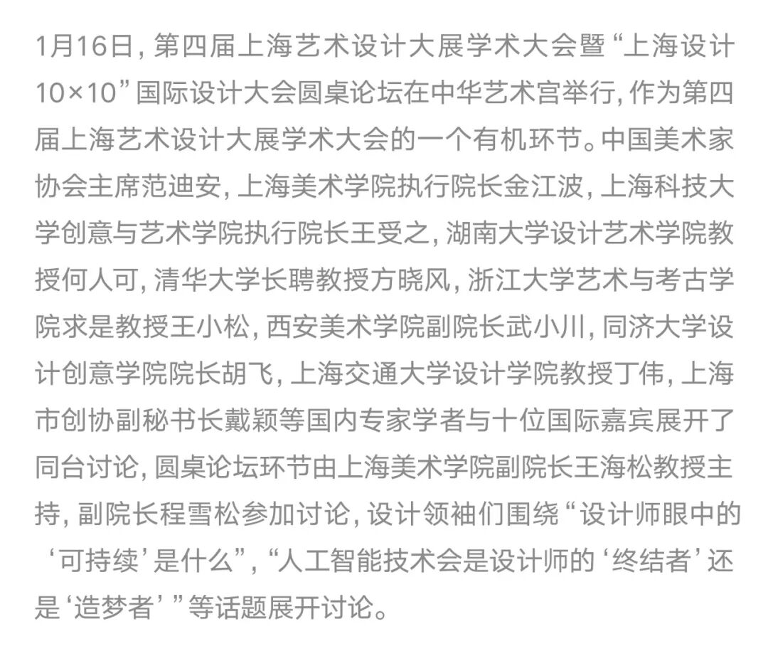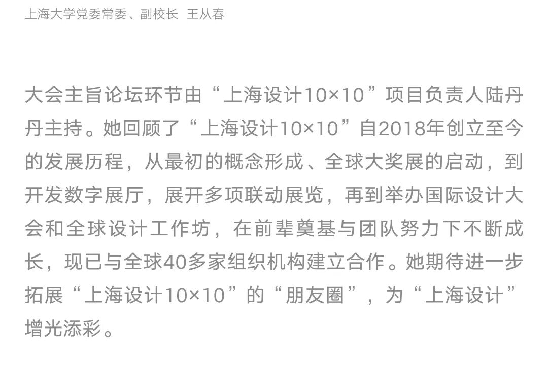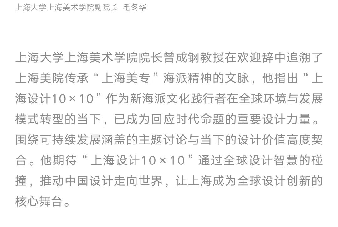 “上海设计10×10”是上海美术学院基于设计学学科使命的“上海设计”概念上建设的展览与交流项目,以“建构平台”“汇聚能量”“相互砥砺”“共创未来”为理念,集结遍布世界各地、历史悠久、跨越大洲、拥有顶级影响力的设计大赛组织及设计机构,每两年内分别举办“上海设计10×10全球大奖展”“上海设计10×10全球设计高峰会”。意在搭建全球设计交流平台,立足上海、放眼全球,提升上海设计之都“上海设计”的全球影响力。通过展览、论坛、工作坊、出版等不同维度,建构连结全球设计“大赛×大奖×大师×大作”的最佳平台,形塑全球设计大奖交流互动的顶级殿堂。同时,与世界顶尖设计大赛组织及设计机构建立合作关系,汇聚全球设计精华。 Based on the mission of the design discipline, Shanghai Academy of Fine Arts has established the exhibition and exchange project of “Shanghai Design 10×10” on the concept of "Shanghai Design". Under the concept of “constructing platform”, “concentrating energy”, “mutually enthusiasm” and “creating the future together”, “Shanghai Design 10×10” gathers design competition organizations and design institutions with worldwide, long-standing, crossing four continents and top influences, and holds “Shanghai Design 10×10 Global Award Exhibition” and “Shanghai Design 10×10 Global Design Summit” every two years. With the base of Shanghai and the global view, the events aim to build an international design exchange platform and enhance the design competitiveness of Shanghai Design Capital. Through exhibitions, forums, publications and other different dimensions, the event is built into the best platform to connect the global design “big competitions, grand prizes, masters, great works”, and has become the top hall for communication and interaction of global design awards. At the same time, “Shanghai Design 10×10” has established cooperative relationships with the world's top design competition organizations and design institutions, bringing together the essence of global design.