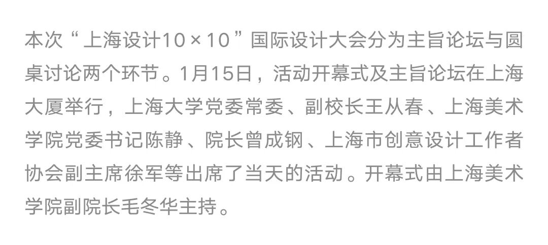 “上海设计10×10”是上海美术学院基于设计学学科使命的“上海设计”概念上建设的展览与交流项目,以“建构平台”“汇聚能量”“相互砥砺”“共创未来”为理念,集结遍布世界各地、历史悠久、跨越大洲、拥有顶级影响力的设计大赛组织及设计机构,每两年内分别举办“上海设计10×10全球大奖展”“上海设计10×10国际设计大会”。意在搭建全球设计交流平台,立足上海、放眼全球,提升上海设计之都“上海设计”的全球影响力。通过展览、论坛、工作坊、出版等不同维度,建构连结全球设计“大赛×大奖×大师×大作”的最佳平台,形塑全球设计大奖交流互动的顶级殿堂。同时,与世界顶尖设计大赛组织及设计机构建立合作关系,汇聚全球设计精华。 Based on the mission of the design discipline, Shanghai Academy of Fine Arts has established the exhibition and exchange project of “Shanghai Design 10×10” on the concept of "Shanghai Design". Under the concept of “constructing platform”, “concentrating energy”, “mutually enthusiasm” and “creating the future together”, “Shanghai Design 10×10” gathers design competition organizations and design institutions with worldwide, long-standing, crossing four continents and top influences, and holds “Shanghai Design 10×10 Global Award Exhibition” and “Shanghai Design 10×10 Global Design Summit” every two years. With the base of Shanghai and the global view, the events aim to build an international design exchange platform and enhance the design competitiveness of Shanghai Design Capital. Through exhibitions, forums, publications and other different dimensions, the event is built into the best platform to connect the global design “big competitions, grand prizes, masters, great works”, and has become the top hall for communication and interaction of global design awards. At the same time, “Shanghai Design 10×10” has established cooperative relationships with the world's top design competition organizations and design institutions, bringing together the essence of global design.