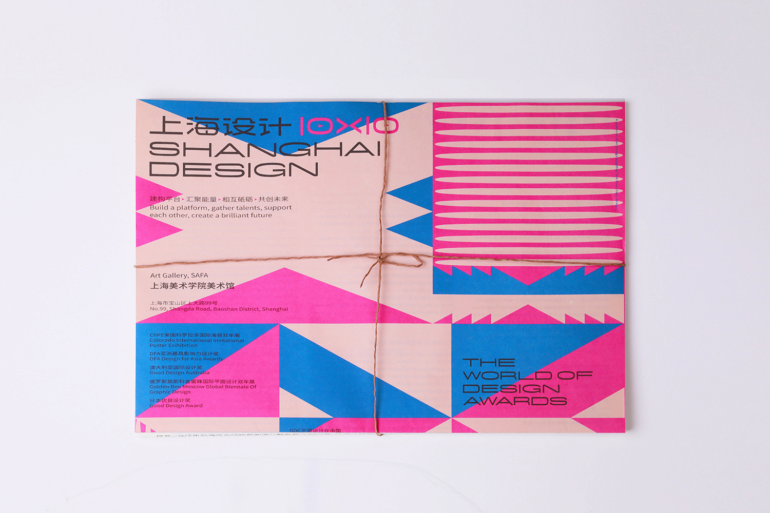 “上海设计10×10”是21件国际顶级设计大赛获奖作品组成的集合展。围绕“搭建平台,聚集人才,相互支持,共创未来”的主题,运用乘号、箭头等不同符号,突出创意的碰撞理念。中英文字体采用平面形式,线条流畅柔和。